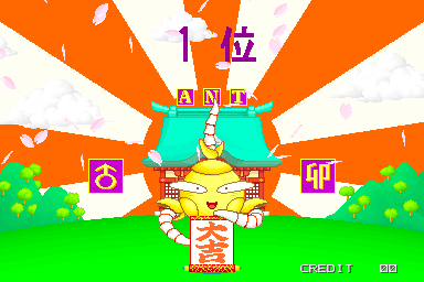 | If you're good enough, you input your initials when the 'continue?' prompt appears- this is why you're given 20 seconds instead of 10. Amusingly, if you immeadiately continue, you lose the chance to put your name in! | If you're good enough, you input your initials on a seperate screen with a Japanese shrine in the background, where you also put your gender and either your birth month or starsign. Then a super-deformed Flint appears to congratulate you as the sun shines. Here's a screenshot. |