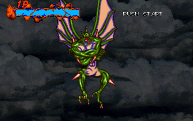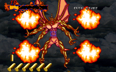 When his health starts to go down, Pal-Beast flies further into the background, and the kid gloves are off- his attacks from the background are brutal, and will almost certainly cost you a couple of lives. His primary attack back here is to spew flames from his mouth, but this attack doesn't count as a projectile, as it can't be shot out of harm's way- it's a flamethrower! Unlike all the other attacks in the entire game, shooting Pal-Beast anywhere won't stop it- from what I've seen, the only way to stop the flamethrower is to shoot him in the head as much as you can. Even if you fill his mouth with enough bullets to put down a small elephant, you'll almost certainly take at least one hit here. If you don't do anything about it, he simply won't stop, eating through your life bar like it's not there. I'd say this is the cheapest attack in the game, but at least it can be stopped...