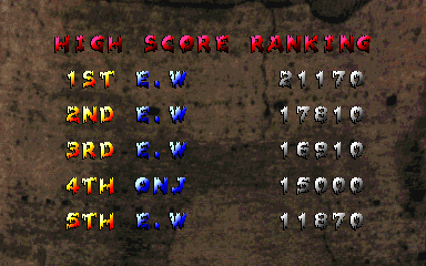 We also get some credits, too! For what it's worth, the design team at American Sammy seems to consist of half American, half Japanese staff, which seems a bit strange for a company calling itself American Sammy. The Japanese coders probably came over from the Japanese arm of the company. Sorta like Sonic Team USA. Wait, why am I talking like I even know about this sort of thing?! Let's just cut right to the best part of the article- HIGH SCORE TABLE TIME!!