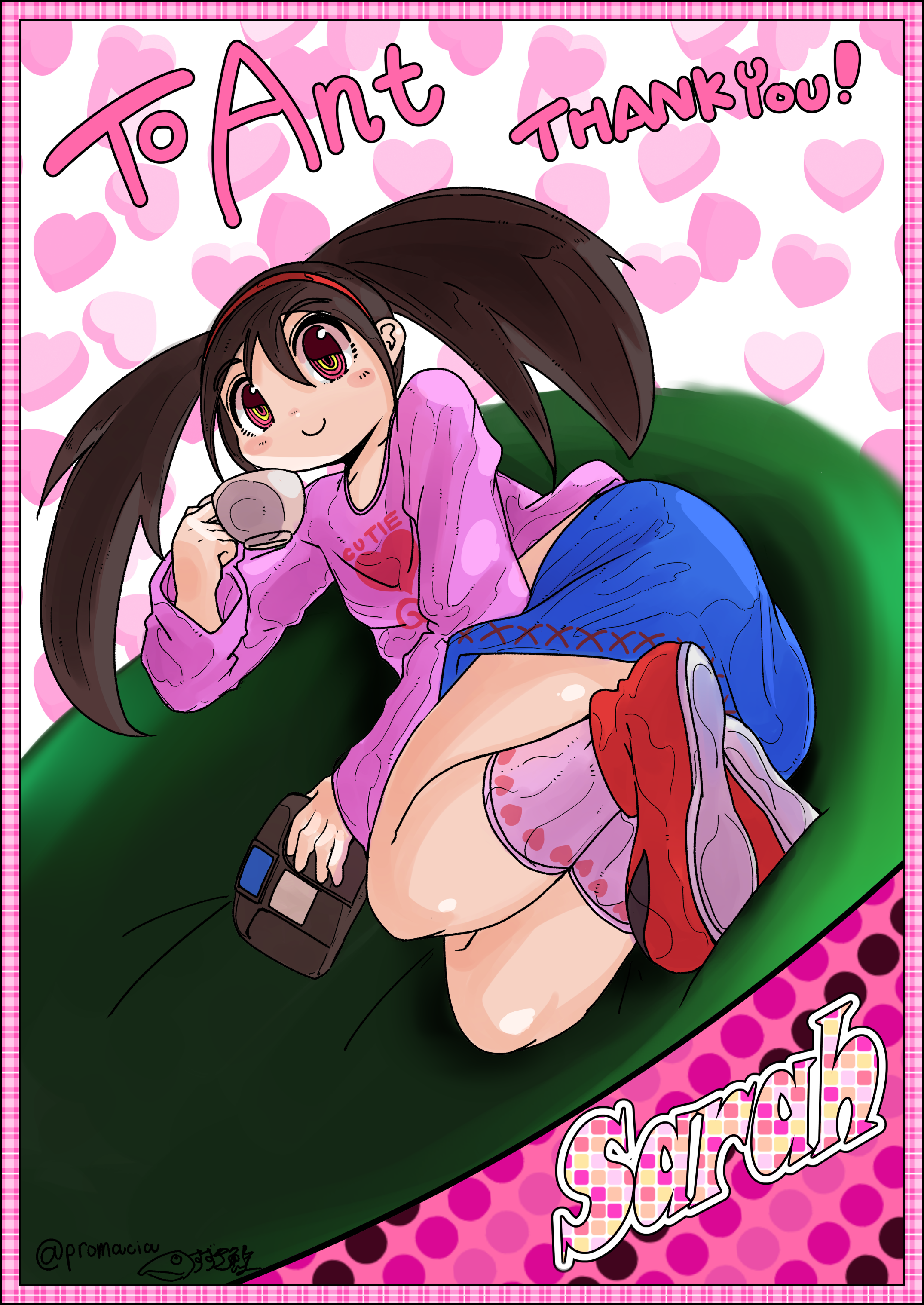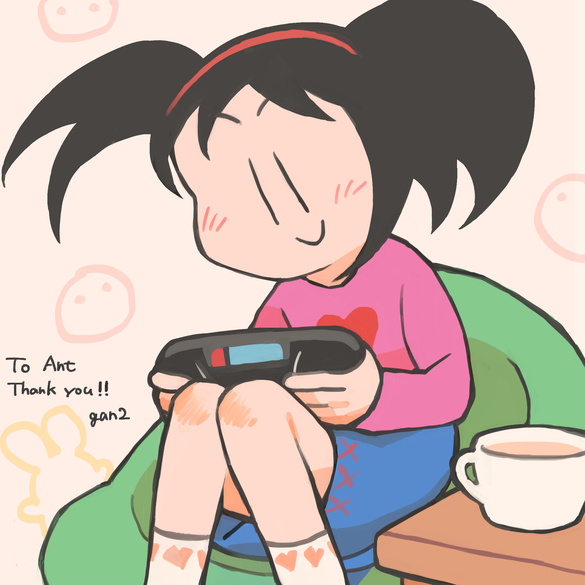 Skeb art time again! This time, courtesy of promacia, Sowertty's enjoying a nice bit of Game Gear action in a comfy pose:
